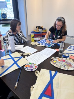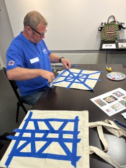 Over the two-hour session, we explored a wealth of creative possibilities while engaging in the delightful process of creating art ourselves! Supported by Lynne McNally, one of the festival artists this year, Lynne guided the group through the step-by-step process of designing a unique canvas bag. Utilizing fabric paints and tape, participants crafted templates that would bring their artistic visions to life.
